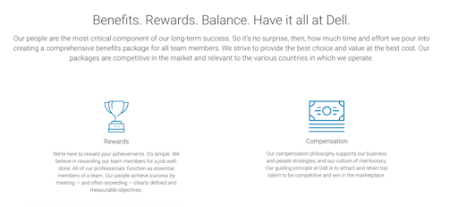 The research indicates that quickly making potential benefits and perks known to candidates is highly valued by top talent. Dell’s career website does a brilliant job of this. Its clear message and focus on its employee benefits gives it a strong competitive advantage when recruiting top talent.