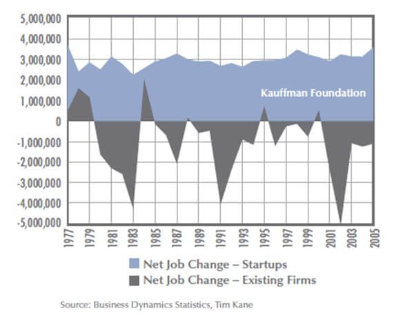 Entrepreneurs play a major part in driving innovation and a growing economy. According to a study by the Kauffman Foundation (the world’s largest non-profit foundation dedicated to the support of entrepreneurship), entrepreneurs and their startup teams are, and have been, the ONLY source of net new jobs in almost every year since 1977! (The chart below reveals how startups have consistently created new jobs, compared to existing organizations.)