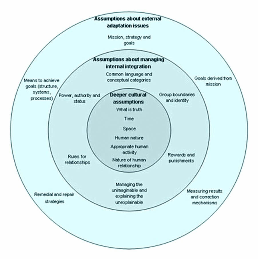 MIT Management Professor, Edgar Schein , presents culture as a series of assumptions people make about an organization. These assumptions occur at three levels — each is more difficult to articulate and change. Schein’s three-tier structure includes: